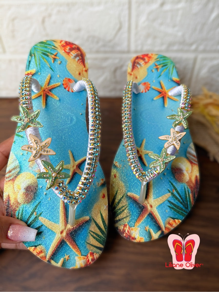 Transforme seu visual com um calçado que une beleza, qualidade e conforto, perfeito para mulheres que buscam autenticidade e elegância no verão. Sinta a leveza e o frescor do mar a cada passo com o chinelo "Estrelas".