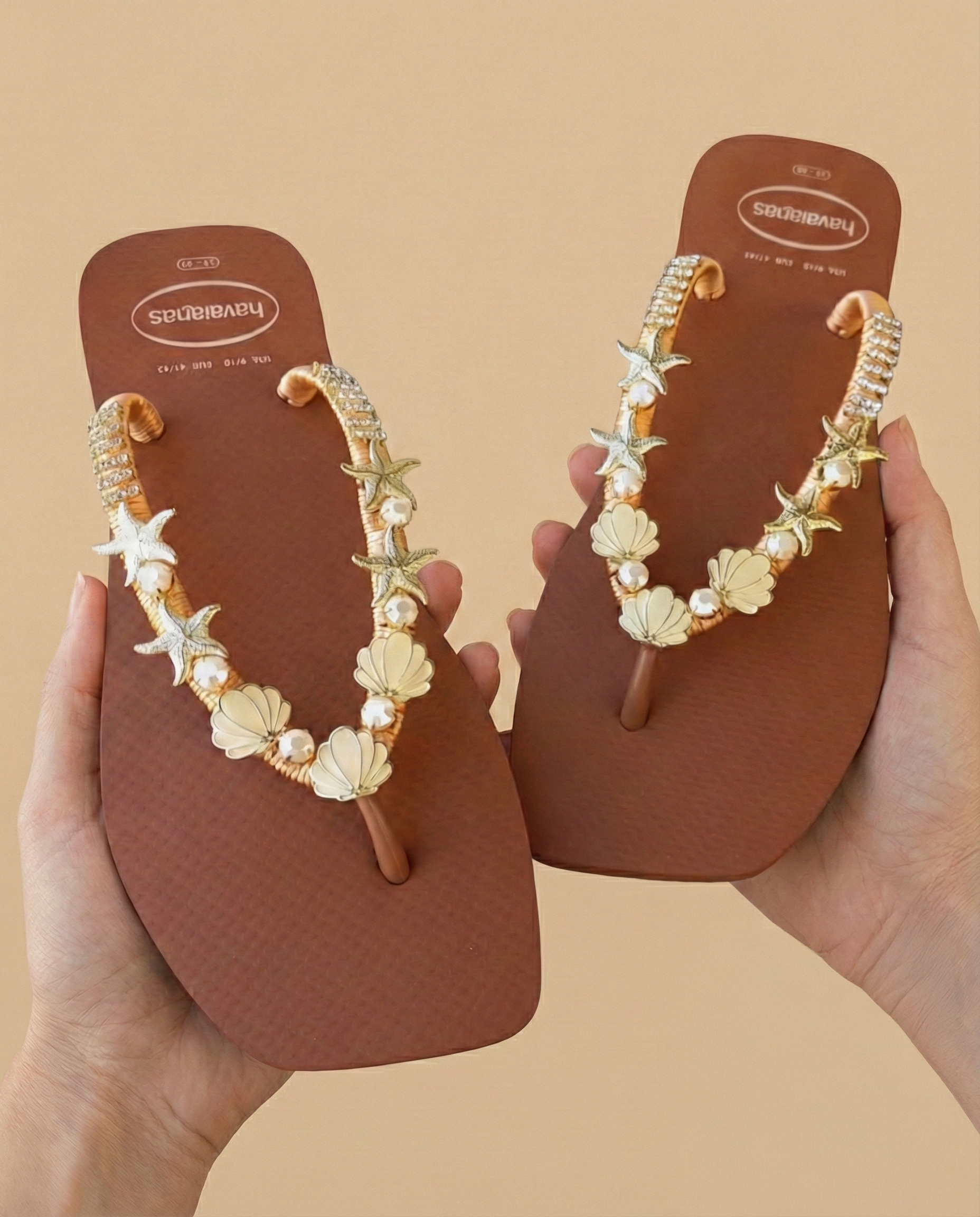 Inspirado na beleza do oceano, esse chinelo é puro encanto e sofisticação. Com aplicações delicadas de conchas, estrelas-do-mar e pérolas, ele traz um visual elegante, feminino e exclusivo — perfeito para quem ama detalhes que fazem a diferença.