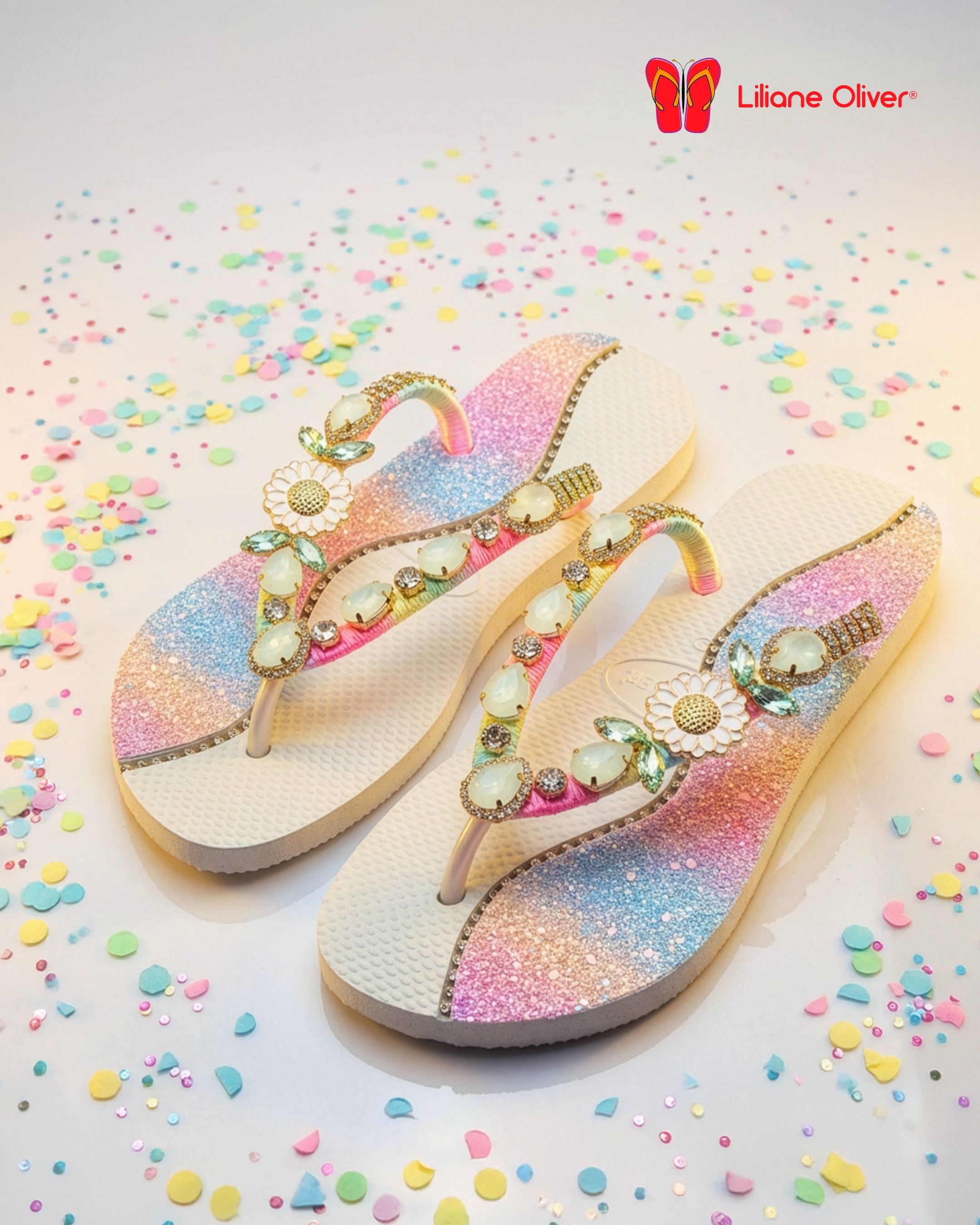Apresentamos a sandália Margarida Jardim a combinação perfeita entre elegância e sofisticação para quem busca um toque exclusivo no visual. Com base colorida texturizada e enfeites de cristais iridescentes que refletem a luz em tons mágicos, ela transforma qualquer look em uma experiência única. O detalhe do recorte na sola adiciona charme e personalidade, ideal para ocasiões especiais ou para quem deseja se destacar no dia a dia.