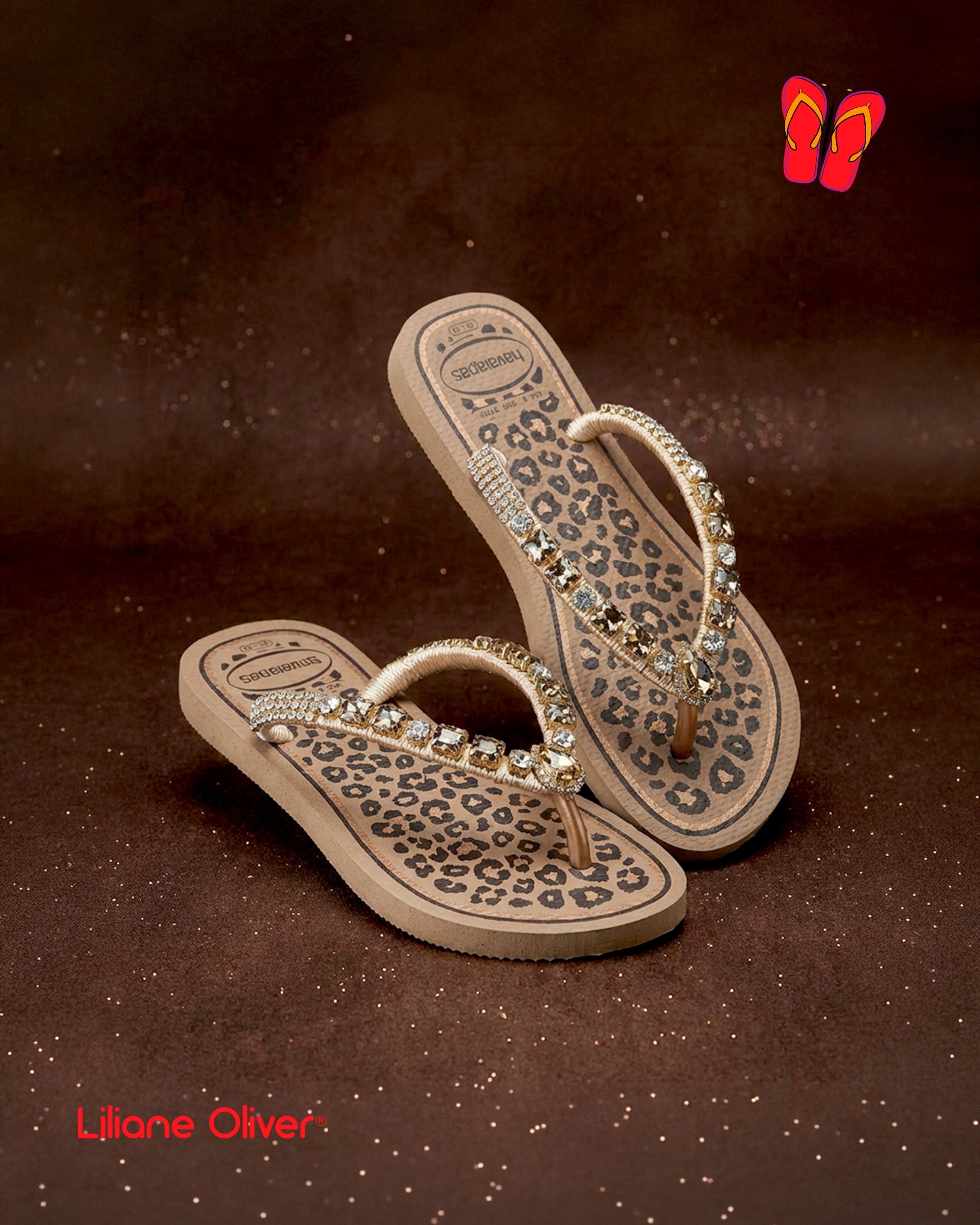 Esse chinelo é a definição de luxo + atitude. Com estampa animal print sofisticada e tiras trabalhadas com pedrarias douradas, ele transforma qualquer look básico em uma produção poderosa e cheia de estilo.